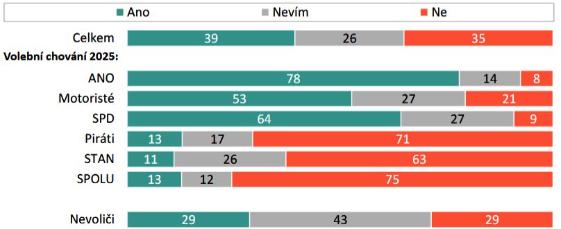 Výrazně nejsilněji jsou o existenci jasné vládní vize přesvědčeni voliči hnutí ANO. Ti se to domnívají ve více než třech čtvrtinách případů [78 %]. Mezi voliči Motoristů [53 %] a SPD [64 %] taktéž převažuje toto očekávání. Ovšem více než čtvrtina z nich [27 %] si tím není jistá. Na opačné straně názorového spektra stojí voliči momentálních opozičních stran, u kterých silně převažuje názor, že vláda postrádá jasnou představu o směřování naší země.